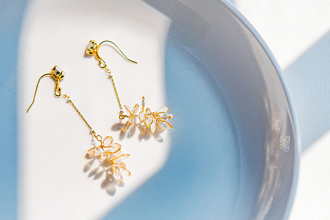 • 飾品為金屬材質,使用完畢建議用吹風機,以冷風稍微吹乾飾品上的濕氣,保持乾燥。